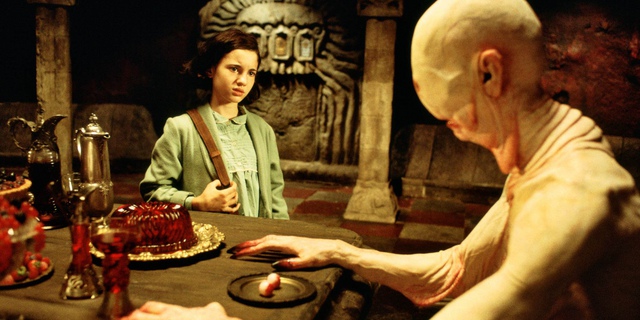 Near the house is a stone labyrinth that is easy to get lost into. But it turns out this labyrinth is enchanted and visited by fairies and a faun (presumably the “Pan” in the title, but no one refers to him by name). The faun believes that Ofelia is a lost princess from his world of enchantment and tests her skills by giving her three tasks. If she succeeds for all three, she gets invited to stay in the fantasy world, free from the trouble that is life and away from her the cruel Captain Vidal. One of her tasks involves a run-in with a scary pale man with pale and decomposing skin all over his body (oh, and he has eyeballs in the palms of both his hands). He chases her because she breaks the rules of the task—that’s an easy life lesson for kids who do wind up seeing this movie.
