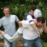 This results in multiple shots to the crotch and other injuries. Now, as tired as I am of the comedic “shots to the crotch” cliché, it works here because a) they’re still funny here and b) they help serve the story. The sequences in which the boys film their own stunts using the family video camera are amusing, fun to watch, and actually about something. This could have been a formulaic romp about cardboard characters who simply run around nearly getting themselves killed. But no—director Collin Buchanan is very careful in making us empathize with the characters. They’re not completely idiotic—in fact, Bobby, Bo, and Sammy are smart in their own way. And everything they do is for the family. This is where part of the film’s heart comes into place. There are also some brief awkwardly-funny but somewhat-sweet moments between Bobby and Hattie, although their relationship could have gotten a little further before the emotional payoff at the end. Actually, this is what cost the film half-a-star. Maybe if the film were a little longer so it could have a few more moments with Bobby and Hattie, this would have gotten four stars instead of three-and-a-half.