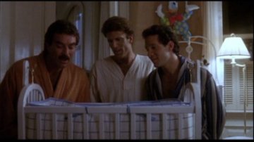 Then, the next day, actor Jack (Danson) leaves to shoot a film in Turkey for about ten weeks, but architect Peter (Selleck) and cartoonist Michael (Guttenberg) find a big surprise waiting on their doorstep. It’s a little baby, asleep in a bassinet with a note attached to it. The baby is Jack’s after an affair from long ago. The mother has sent the baby, named Mary, to the apartment. With Jack not around, Peter and Michael are forced to handle the situation, but of course know absolutely nothing about taking care of a baby. They refer to Mary as “it,” don’t know how to entertain her when she’s crying, doesn’t know what she eats, and, in one of the film’s funniest scenes, they figure out how to change a diaper. Their confusion is not helped when they go out to the store to buy baby food, and there seems to be a lot depending on the age, which they don’t know. Each day passes by and they’re still miserable and confused with this bundle. All the baby does is eat and poop. But later with each day, they actually start to love Mary.