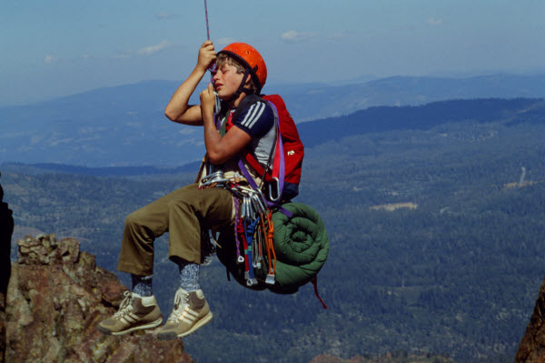 There’s another sequence in which Vic takes the boys on a rough climb on a mountain called Devil’s Tooth. When they run out of rock, they are forced to pendulum across to the nearest surface rock. This is also well-shot and I was fooled into thinking that the real actors pulled off this stunt, and not stunt doubles. It seems fun, because they think it’s fun…everyone except Alan, who unfortunately slips and hangs on for dear life while he dangles on the edge of a rock face.